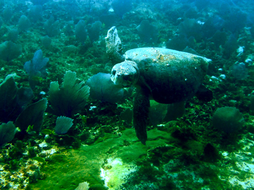 At one point a loggerhead sea turtle about 2 meters long dropped in to see what we were doing. It swam along the edge of the ledge, went right up to diver Mike Haley for a look, then, it’s curiosity apparently satisfied, headed off into the murk. At a different spot on the reef, some dolphins dropped in to check on the conch team (see video here).
